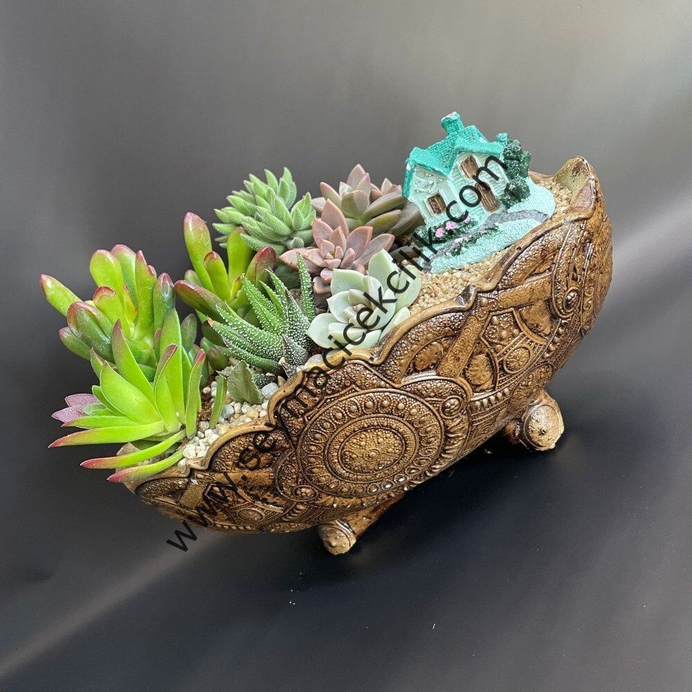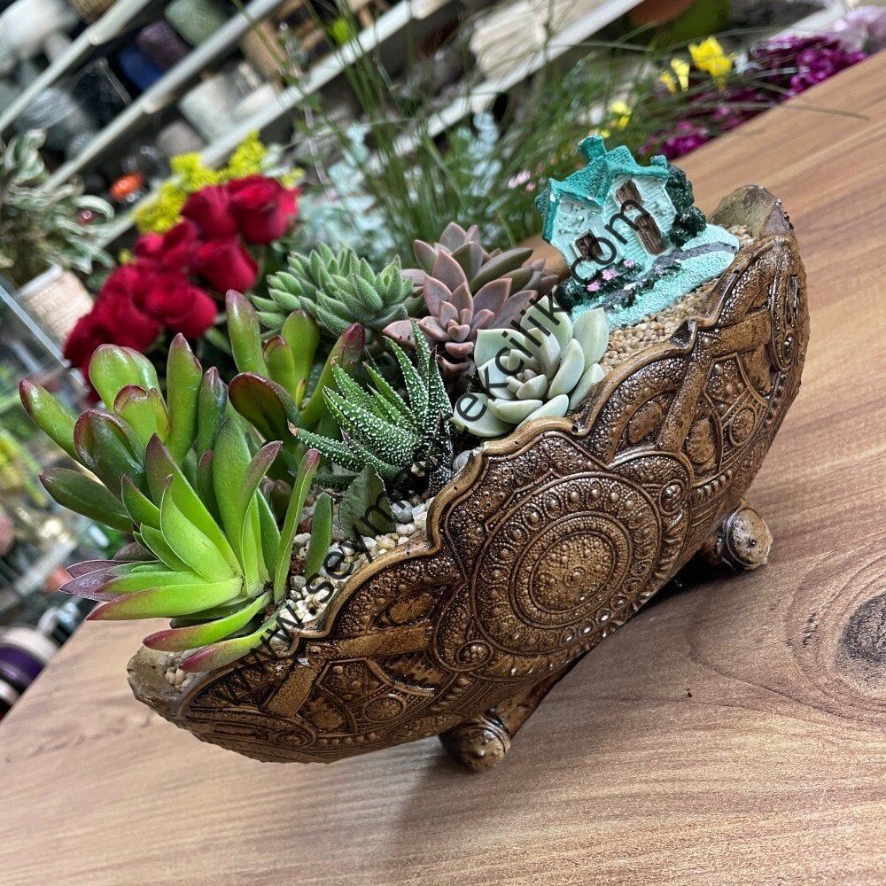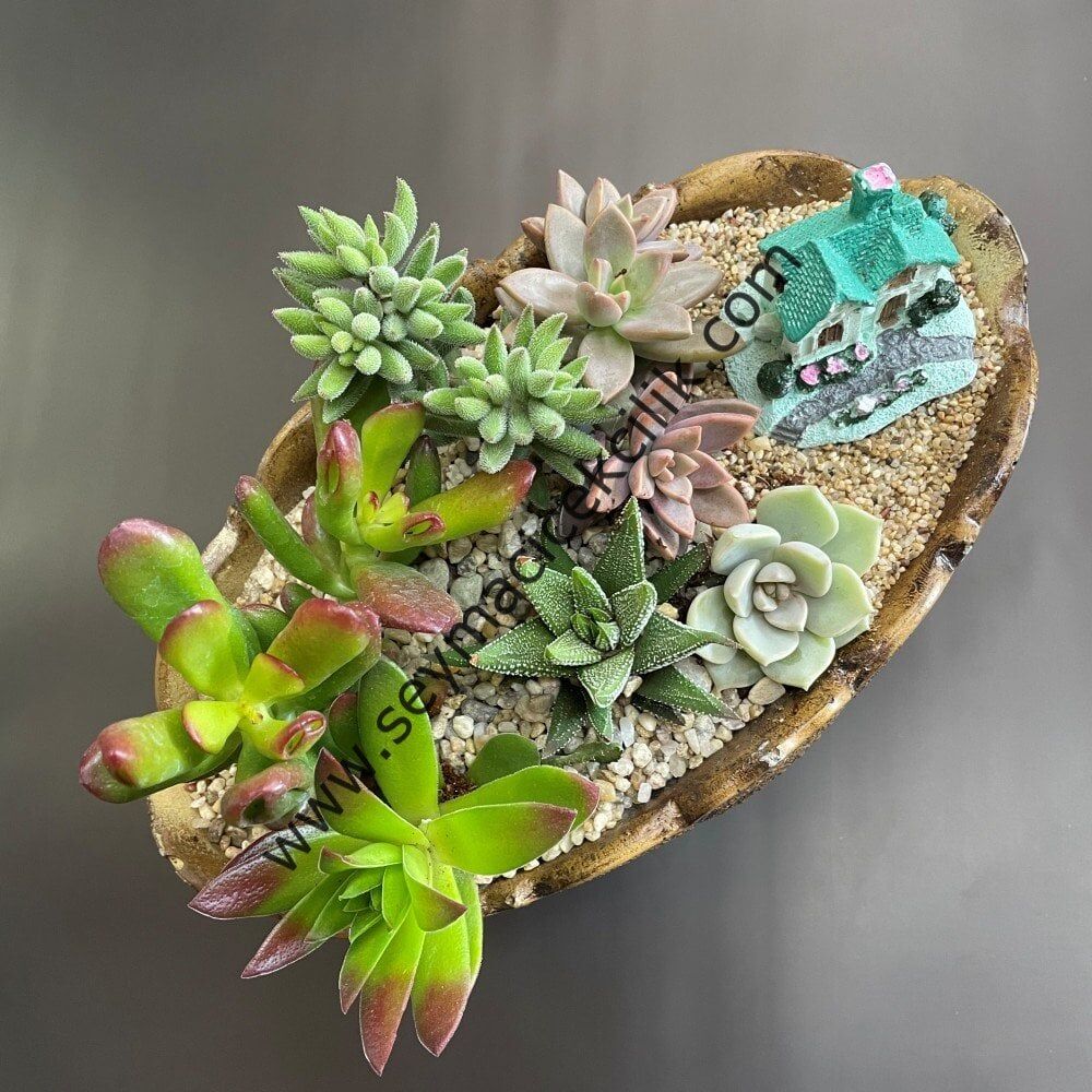 Ürün, beton saksı, 7 adet farkli türde sukulent çeşidi ve 1 adet obje ile aranje edilmiştir.