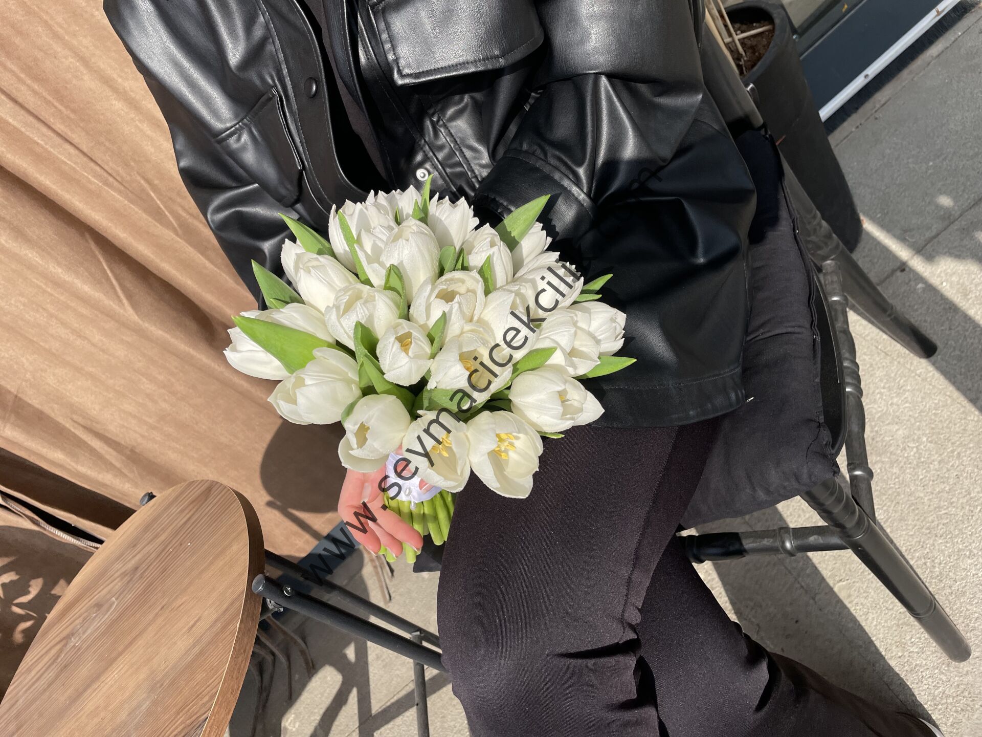 Gelin buketimiz 35 adet ithal beyaz lale ile hazırlanmıştır.