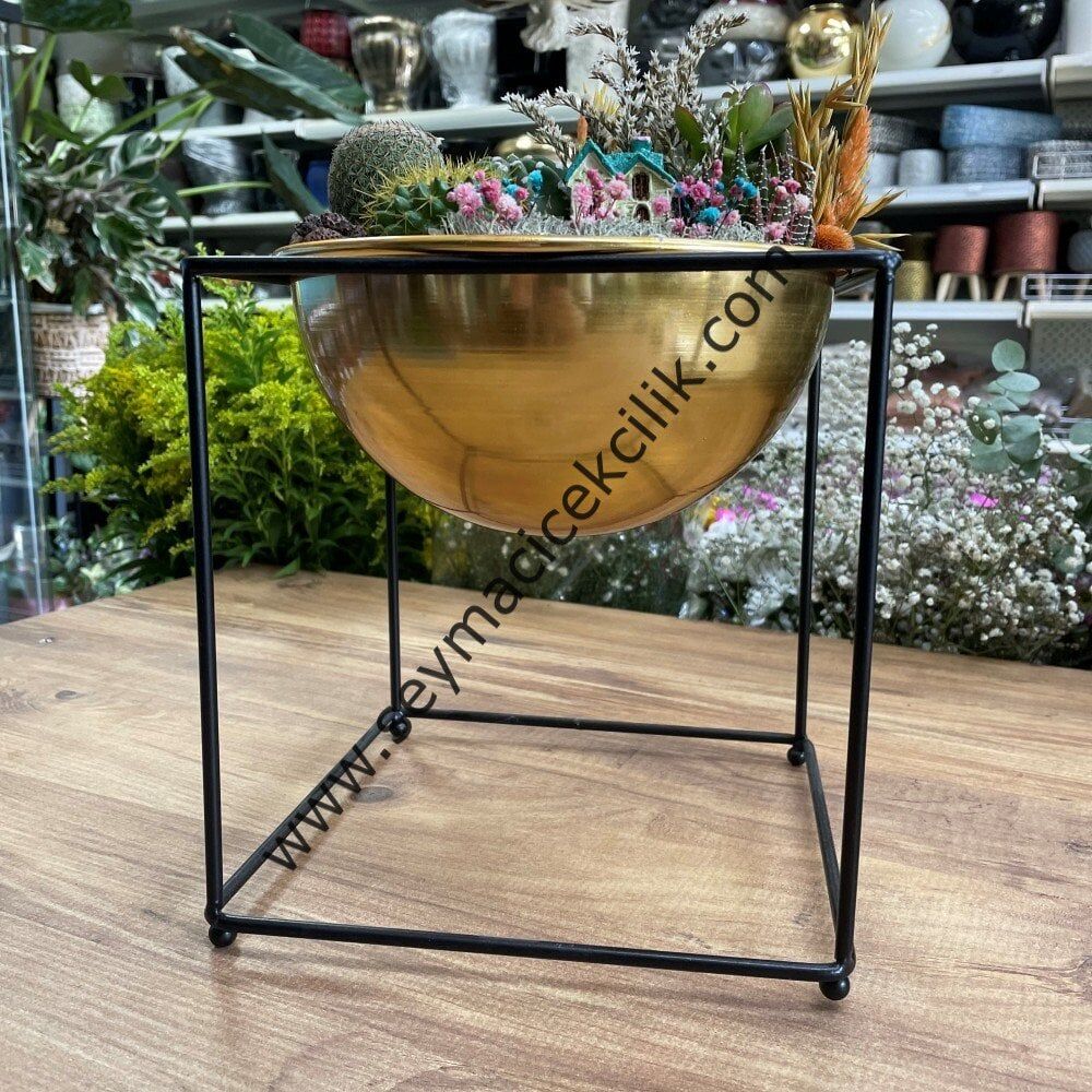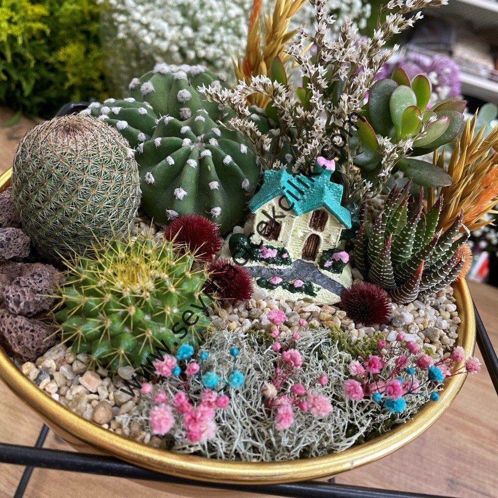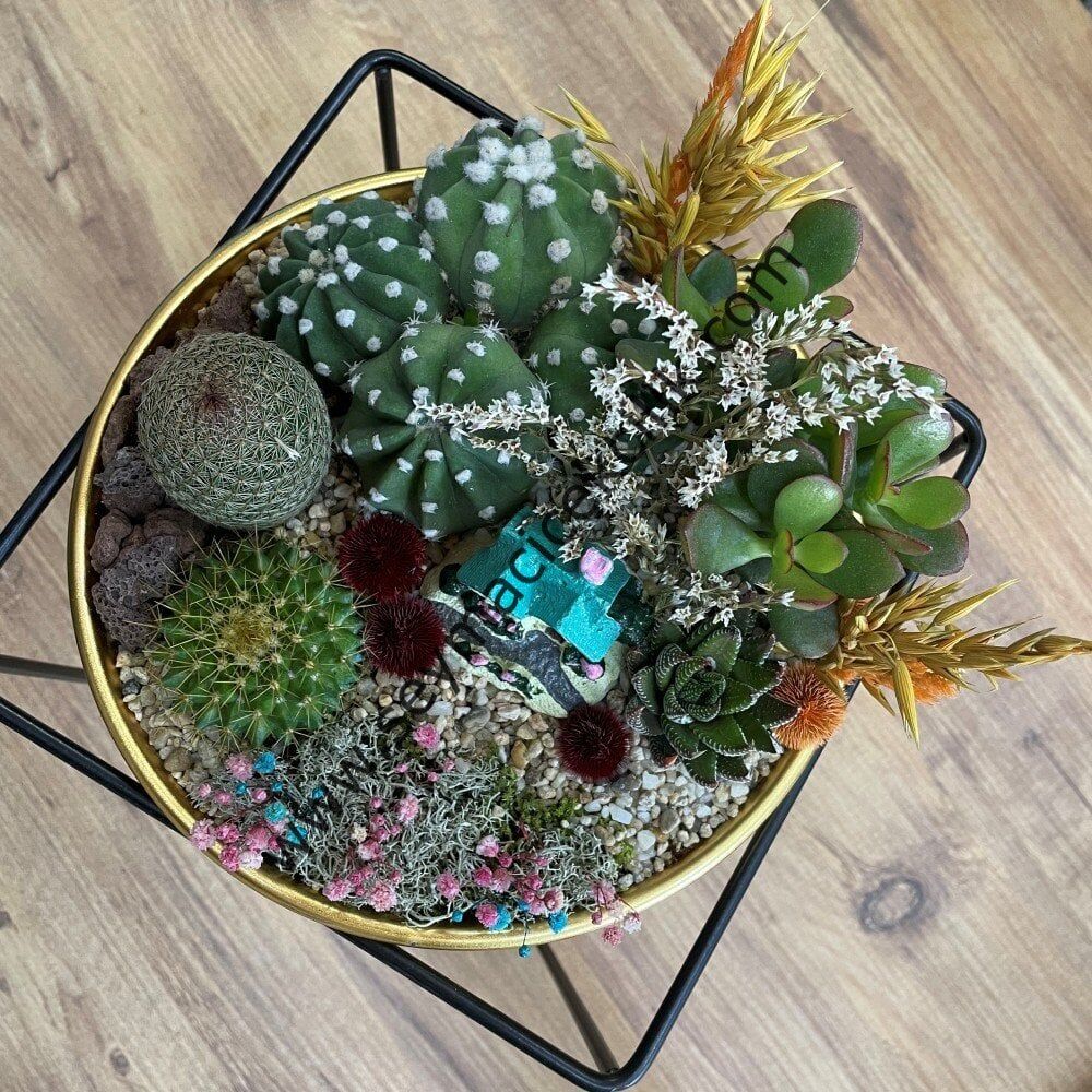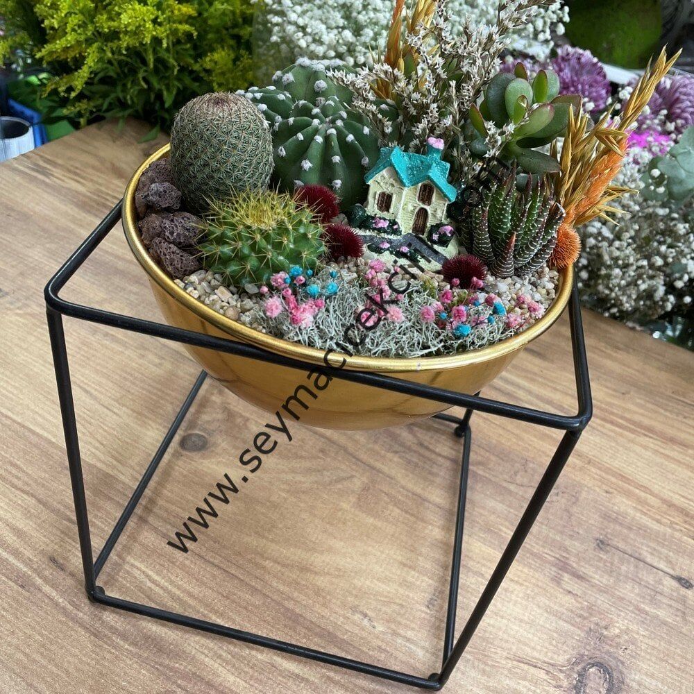 Saksı; metal ayaklı, gold renk yine metal çanaktan üretilmiştir. Aranjede 2 adet sukulent, 6 adet kaktüs ve 1 adet obje kullanılmıştır.