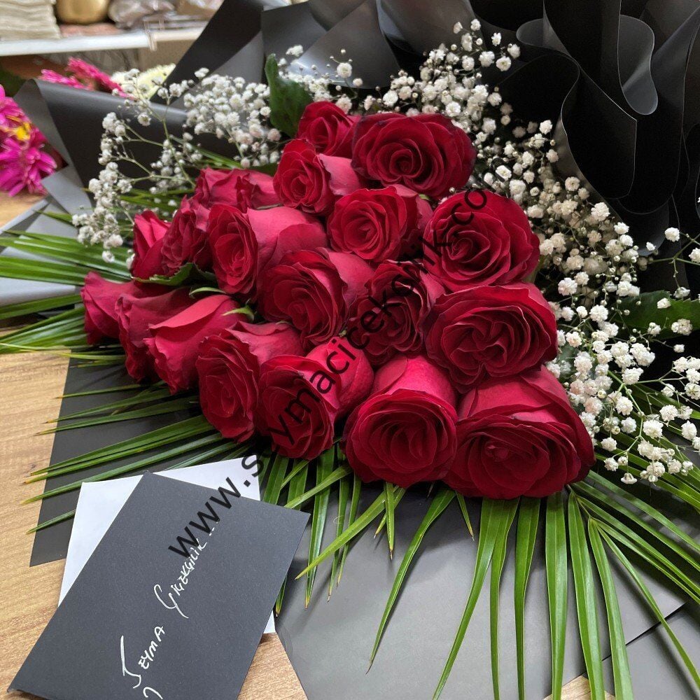 Ürün içeriğide 21 kırmızı ithal gül, cipso ve 3 adet fenix yaprağı bulunmaktadır.