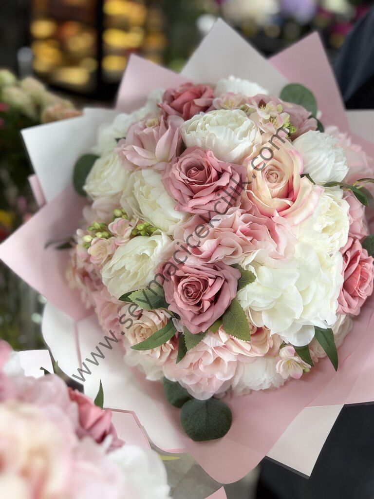 Buketimiz karışık renklerde yapay bez çiçeklerle hazırlanmıştır.
