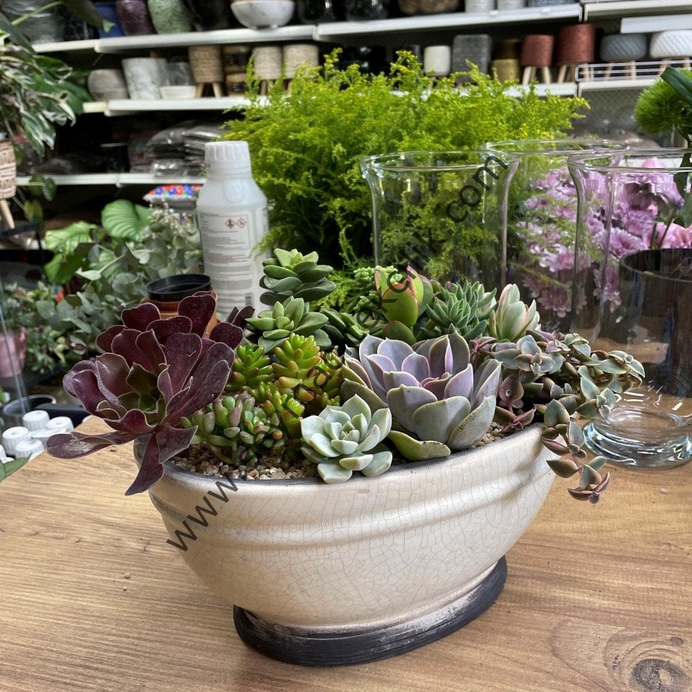 Aranjede 6 adet büyük, 6 adet küçük olmak üzere 12 adet farklı türlerde sukulent kullanılmıştır. Saksı rengi stok durumuna göre değişiklik gösterebilir.