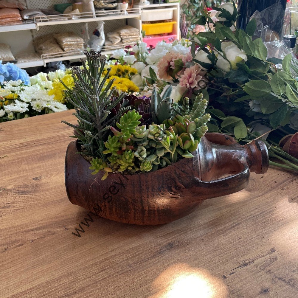 Aranjede 6 adet büyük, 5 adet küçük olmak üzere 11 adet farklı türlerde sukulent kullanılmıştır.