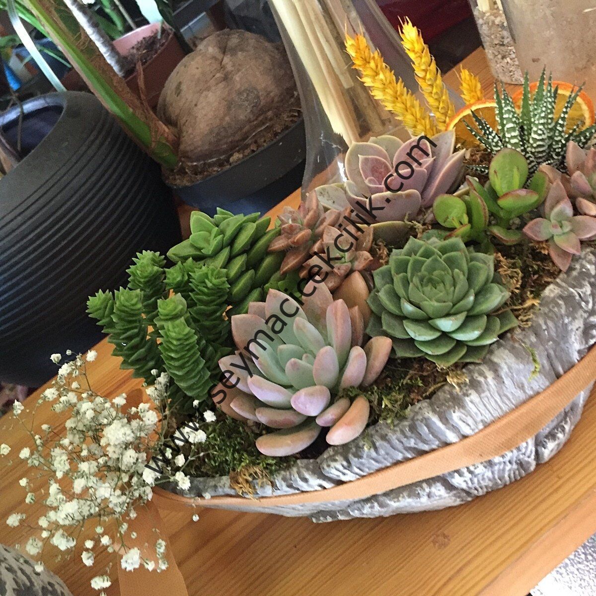 Ürün, beton saksı, 12 adet sukulent çeşidi ve şoklanmiş ithal çiçekler ile aranje edilmiştir. Aranjede, Şeyma Çiçekçiliğin Sukulentler için özel olarak hazırlanmış karşım kullanılmıştır.